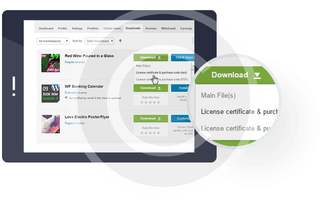 - Click “download” button, and in the drop-down menu select “license certificate & purchase code”.